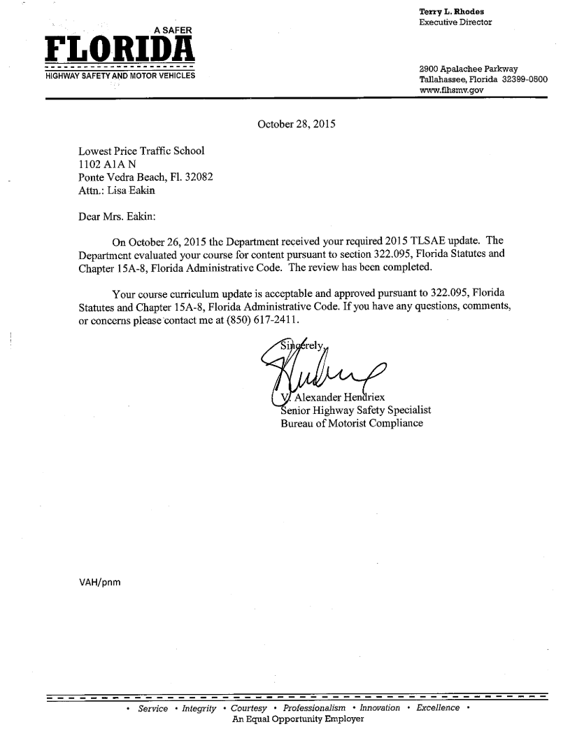 Al elegir LowestPriceTrafficSchool.com, te inscribes en cursos en línea que están oficialmente aprobados por el Departamento de Seguridad Vial y Vehículos Motorizados de Florida (FLHSMV).