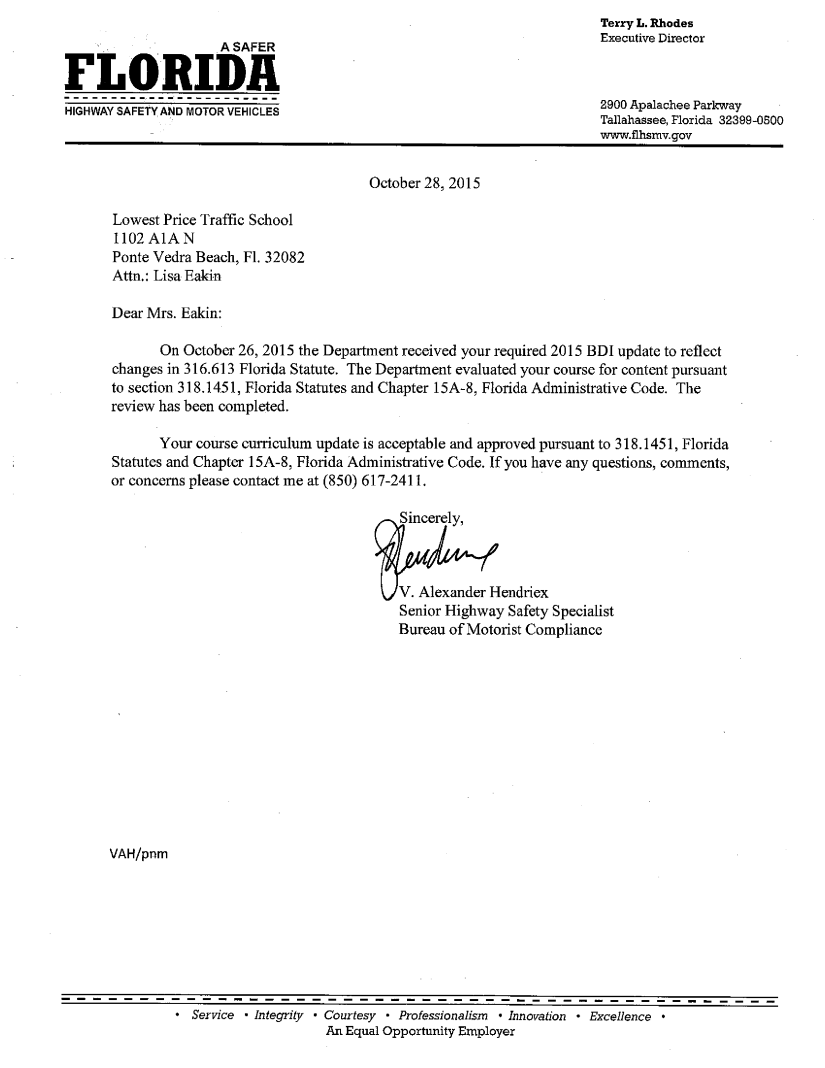 Todos nuestros cursos están oficialmente aprobados por el Departamento de Seguridad Vial y Vehículos Motorizados de Florida (FLHSMV) y son aceptados en todas las jurisdicciones de Florida.